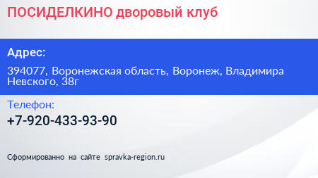 ПОСИДЕЛКИНО, дворовый клуб по адресу 394077, Воронежская область, Воронеж, Владимира Невского, 38г в дальнейшем Организация, размещена в следующих категориях: