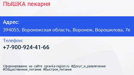 ПЫШКА, пекарня по адресу 394055, Воронежская область, Воронеж, Ворошилова, 7е в дальнейшем Организация, размещена в следующих категориях: