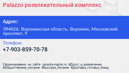 Palazzo, развлекательный комплекс по адресу 394026, Воронежская область, Воронеж, Московский проспект, 9 в дальнейшем Организация, размещена в следующих категориях: