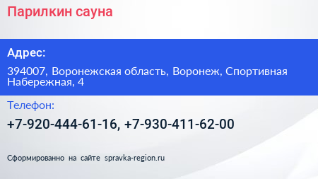 Парилкин, сауна по адресу 394007, Воронежская область, Воронеж, Спортивная Набережная, 4 в дальнейшем Организация, размещена в следующих категориях: