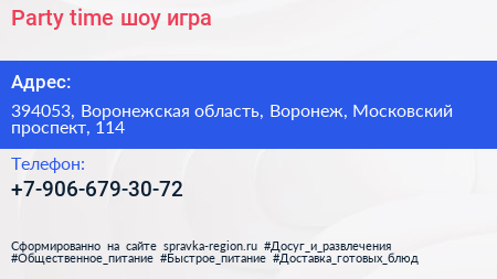 Party time, шоу-игра по адресу 394053, Воронежская область, Воронеж, Московский проспект, 114 в дальнейшем Организация, размещена в следующих категориях: