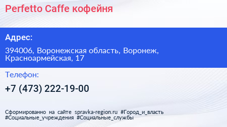 Perfetto Caffe, кофейня по адресу 394006, Воронежская область, Воронеж, Красноармейская, 17 в дальнейшем Организация, размещена в следующих категориях: