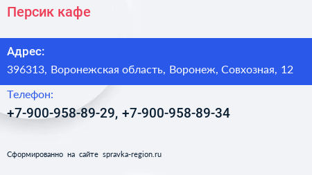 Персик, кафе по адресу 396313, Воронежская область, Воронеж, Совхозная, 12 в дальнейшем Организация, размещена в следующих категориях: