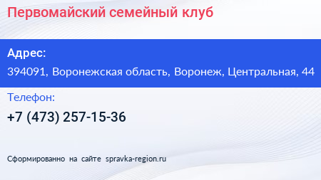 Первомайский, семейный клуб по адресу 394091, Воронежская область, Воронеж, Центральная, 44 в дальнейшем Организация, размещена в следующих категориях: