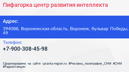 Пифагорка, центр развития интеллекта по адресу 394088, Воронежская область, Воронеж, бульвар Победы, 49 в дальнейшем Организация, размещена в следующих категориях: