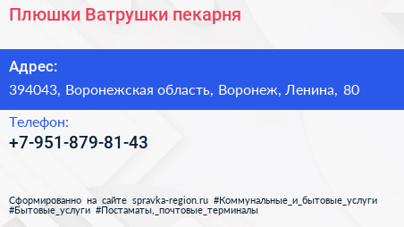 Плюшки Ватрушки, пекарня по адресу 394043, Воронежская область, Воронеж, Ленина, 80 в дальнейшем Организация, размещена в следующих категориях: