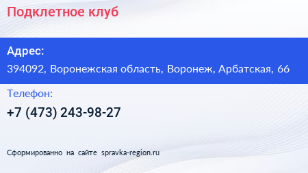 Подклетное, клуб по адресу 394092, Воронежская область, Воронеж, Арбатская, 66 в дальнейшем Организация, размещена в следующих категориях:
