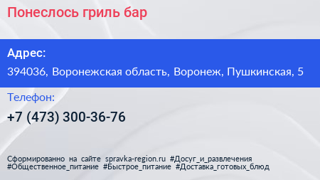 Понеслось, гриль-бар по адресу 394036, Воронежская область, Воронеж, Пушкинская, 5 в дальнейшем Организация, размещена в следующих категориях: