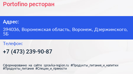Portofino, ресторан по адресу 394036, Воронежская область, Воронеж, Дзержинского, 5Б в дальнейшем Организация, размещена в следующих категориях: