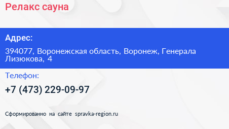 Релакс, сауна по адресу 394077, Воронежская область, Воронеж, Генерала Лизюкова, 4 в дальнейшем Организация, размещена в следующих категориях:
