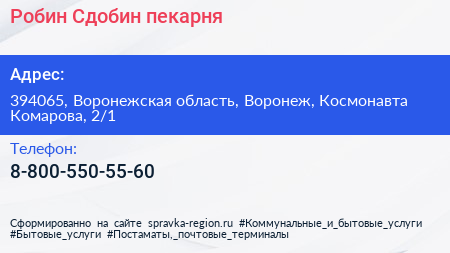 Робин Сдобин, пекарня по адресу 394065, Воронежская область, Воронеж, Космонавта Комарова, 2/1 в дальнейшем Организация, размещена в следующих категориях: