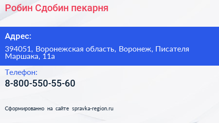 Робин Сдобин, пекарня по адресу 394051, Воронежская область, Воронеж, Писателя Маршака, 11а в дальнейшем Организация, размещена в следующих категориях: