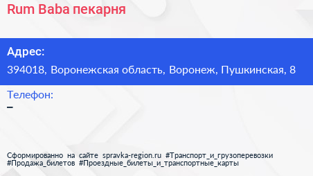 Rum Baba, пекарня по адресу 394018, Воронежская область, Воронеж, Пушкинская, 8 в дальнейшем Организация, размещена в следующих категориях: