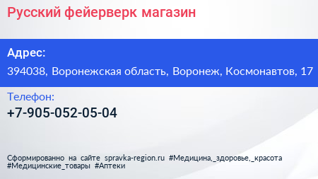 Русский фейерверк, магазин по адресу 394038, Воронежская область, Воронеж, Космонавтов, 17 в дальнейшем Организация, размещена в следующих категориях: