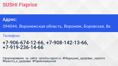 SUSHI Fixprice по адресу 394044, Воронежская область, Воронеж, Боровская, 8а в дальнейшем Организация, размещена в следующих категориях: