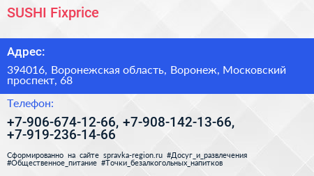 SUSHI Fixprice по адресу 394016, Воронежская область, Воронеж, Московский проспект, 68 в дальнейшем Организация, размещена в следующих категориях: