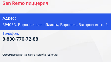 San Remo, пиццерия по адресу 394053, Воронежская область, Воронеж, Загоровского, 1 в дальнейшем Организация, размещена в следующих категориях: