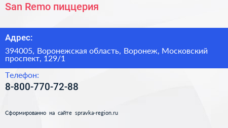 San Remo, пиццерия по адресу 394005, Воронежская область, Воронеж, Московский проспект, 129/1 в дальнейшем Организация, размещена в следующих категориях: