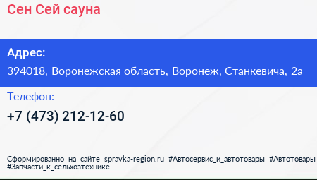Сен Сей, сауна по адресу 394018, Воронежская область, Воронеж, Станкевича, 2а в дальнейшем Организация, размещена в следующих категориях: