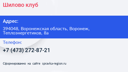Шилово, клуб по адресу 394048, Воронежская область, Воронеж, Теплоэнергетиков, 8а в дальнейшем Организация, размещена в следующих категориях: