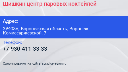 Шишкин, центр паровых коктейлей по адресу 394036, Воронежская область, Воронеж, Комиссаржевской, 7 в дальнейшем Организация, размещена в следующих категориях: