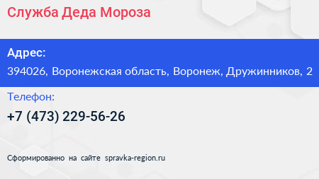 Служба Деда Мороза по адресу 394026, Воронежская область, Воронеж, Дружинников, 2 в дальнейшем Организация, размещена в следующих категориях: