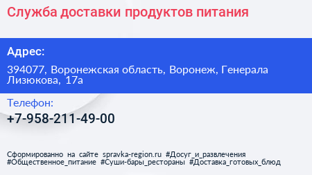 Служба доставки продуктов питания по адресу 394077, Воронежская область, Воронеж, Генерала Лизюкова, 17а в дальнейшем Организация, размещена в следующих категориях: