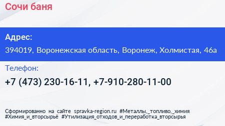 Сочи, баня по адресу 394019, Воронежская область, Воронеж, Холмистая, 46а в дальнейшем Организация, размещена в следующих категориях: