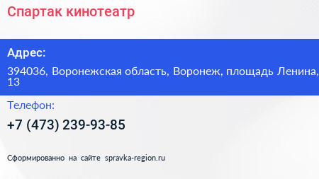 Спартак, кинотеатр по адресу 394036, Воронежская область, Воронеж, площадь Ленина, 13 в дальнейшем Организация, размещена в следующих категориях: