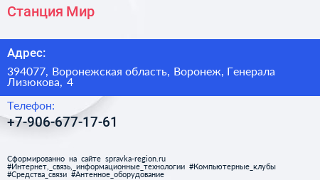 Станция Мир по адресу 394077, Воронежская область, Воронеж, Генерала Лизюкова, 4 в дальнейшем Организация, размещена в следующих категориях: