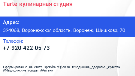 Tarte, кулинарная студия по адресу 394068, Воронежская область, Воронеж, Шишкова, 70 в дальнейшем Организация, размещена в следующих категориях: