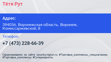 Тётя Рут по адресу 394036, Воронежская область, Воронеж, Комиссаржевской, 8 в дальнейшем Организация, размещена в следующих категориях: