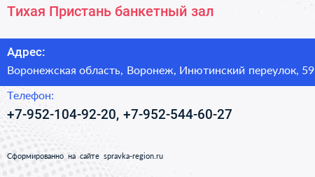Тихая Пристань, банкетный зал по адресу Воронежская область, Воронеж, Инютинский переулок, 59 в дальнейшем Организация, размещена в следующих категориях: