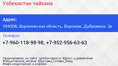 Узбекистан, чайхана по адресу 394008, Воронежская область, Воронеж, Дубровина, 3в в дальнейшем Организация, размещена в следующих категориях: