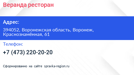 Веранда, ресторан по адресу 394052, Воронежская область, Воронеж, Краснознамённая, 61 в дальнейшем Организация, размещена в следующих категориях: