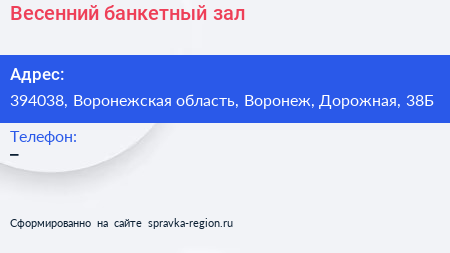Весенний, банкетный зал по адресу 394038, Воронежская область, Воронеж, Дорожная, 38Б в дальнейшем Организация, размещена в следующих категориях: