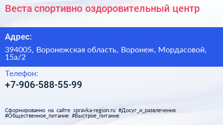 Веста, спортивно-оздоровительный центр по адресу 394005, Воронежская область, Воронеж, Мордасовой, 15а/2 в дальнейшем Организация, размещена в следующих категориях: