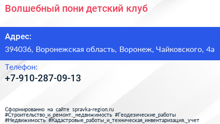 Волшебный пони, детский клуб по адресу 394036, Воронежская область, Воронеж, Чайковского, 4а в дальнейшем Организация, размещена в следующих категориях: