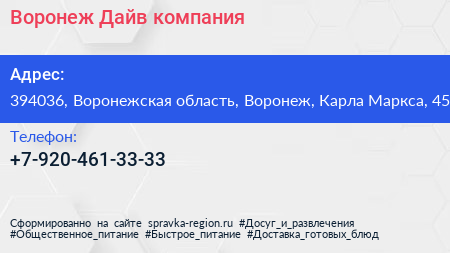 Воронеж Дайв, компания по адресу 394036, Воронежская область, Воронеж, Карла Маркса, 45 в дальнейшем Организация, размещена в следующих категориях: