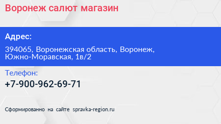 Воронеж-салют, магазин по адресу 394065, Воронежская область, Воронеж, Южно-Моравская, 1в/2 в дальнейшем Организация, размещена в следующих категориях: