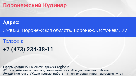 Воронежский Кулинар по адресу 394033, Воронежская область, Воронеж, Остужева, 29 в дальнейшем Организация, размещена в следующих категориях: