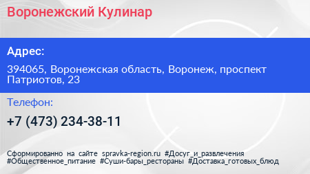 Воронежский Кулинар по адресу 394065, Воронежская область, Воронеж, проспект Патриотов, 23 в дальнейшем Организация, размещена в следующих категориях: