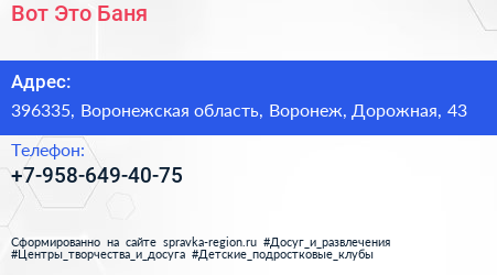 Вот Это Баня по адресу 396335, Воронежская область, Воронеж, Дорожная, 43 в дальнейшем Организация, размещена в следующих категориях: