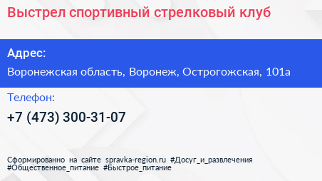 Выстрел, спортивный стрелковый клуб по адресу Воронежская область, Воронеж, Острогожская, 101а в дальнейшем Организация, размещена в следующих категориях: