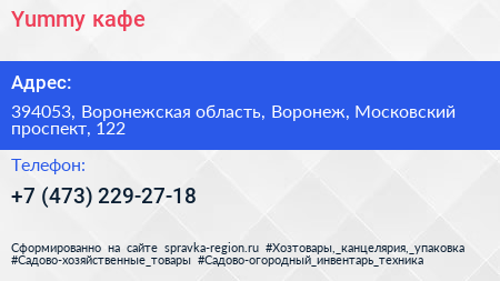 Yummy, кафе по адресу 394053, Воронежская область, Воронеж, Московский проспект, 122 в дальнейшем Организация, размещена в следующих категориях: