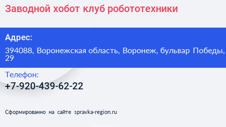 Заводной хобот, клуб робототехники по адресу 394088, Воронежская область, Воронеж, бульвар Победы, 29 в дальнейшем Организация, размещена в следующих категориях:
