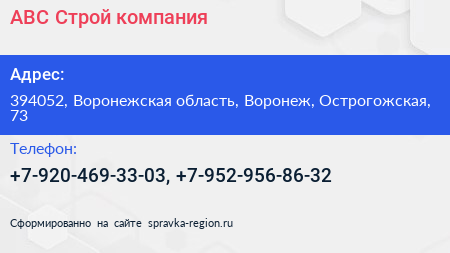 АВС-Строй, компания по адресу 394052, Воронежская область, Воронеж, Острогожская, 73 в дальнейшем Организация, размещена в следующих категориях: