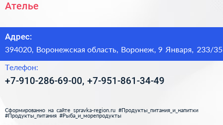 Ателье по адресу 394020, Воронежская область, Воронеж, 9 Января, 233/35 в дальнейшем Организация, размещена в следующих категориях: