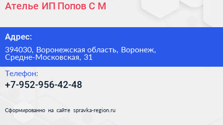 Ателье, ИП Попов С.М. по адресу 394030, Воронежская область, Воронеж, Средне-Московская, 31 в дальнейшем Организация, размещена в следующих категориях: