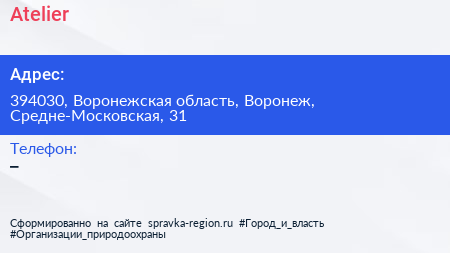 Atelier по адресу 394030, Воронежская область, Воронеж, Средне-Московская, 31 в дальнейшем Организация, размещена в следующих категориях: